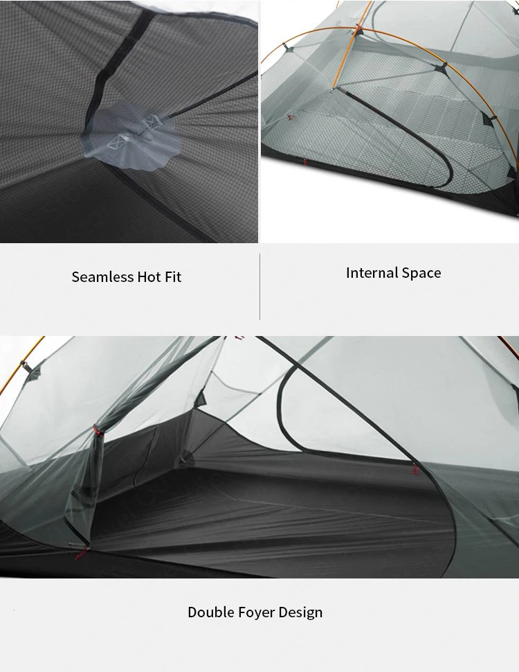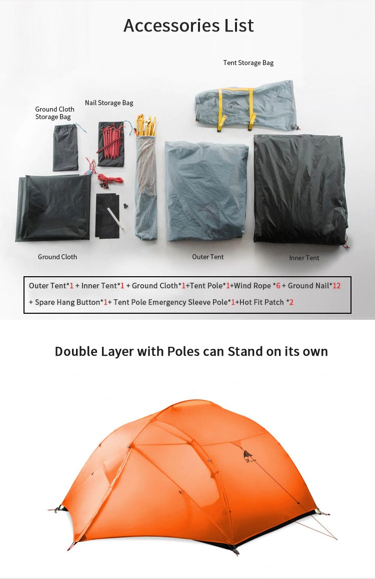 - Accessories: Outer Tent*1 + Inner Tent*1 + Ground Cloth*1+Tent Pole*1+Wind Rope *6 + Ground Nail*12 + Spare Hang Button*1+ Tent Pole Emergency Sleeve Pole*1+Hot Fit Patch *2Color: Green / Orange / Grey